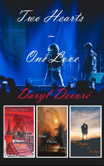 When a drag queen club manager's crazy world collides with a rock star's chaotic life, is there a chance their relationship can survive? Erika Bailey, owner/manager of The Pink Flamingo, a drag queen club in Bangkok, Thailand has happily settled into all aspects of her life, except for her lack of a love life. Darien Scott, a Grammy award-winning, international superstar, wants nothing more than to wake up in the arms of the woman he loves. Too bad contractual obligations force him to shoot hot videos with some of Hollywood's sexiest stars. Yet, Erika and Darien found a way to each other's arms. But between suspecting her father ordered the torching of her club, and her mother's humiliating drunken behaviour, Erika's trust in those she loves is crushed. With all her parents put her through, how can she trust Darien? Concerned for Erika's safety, Darien races to Bangkok to protect her only to discover his brother is missing. Fearing the worst, he contacts his nemesis, Gan, and makes a repulsive deal that will free his brother and protect Erika's club. Or so he thinks. Because when Gan is involved, things always go sour. This time is no different, and Darien sinks into a deep depression. Is Erika's love enough to pull him back and into her arms forever? Daryl Devore's hot rock star romance trilogy – Two Hearts One Love - follows Erika and Darien's crazy, suspense-filled, passionate adventure through Bangkok, Paris, Rio de Janeiro, a hurricane, a reticulated python, a famous drag queen revue, and a tandem skydive. Bonus – exclusive to the box set – a special 2-part interview with Darien Scott.