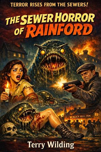 THE SEWER HORROR OF RAINFORD by Terry Wilding Rain has drowned Rainford for weeks. Drains choke. Sewers swell. And something below the cobbled streets has learned how to come up. It starts with a smell. Then the water hesitates. Then the dead are found half-dissolved in their own homes. As brown floodwater bubbles from manholes and back gardens rot into swamps, the village discovers it is under siege by a crawling horror born of chemical waste and neglect. Acid-slimed creatures rise through sinks, toilets, and gutters, feeding, multiplying, and adapting faster than anyone can understand. Maggie Hargreaves and her family are among the last to realise the truth. This is no freak infestation and no act of God. Whatever lives beneath Rainford has survived long enough to learn what it does to flesh. When the streets fall silent and the rain will not stop, survival comes down to fire, salt, and how long you can keep the doors shut. Because the sewers are full. And the horror is already climbing. A brutal, old-school tale of rural dread and unstoppable infestation, THE SEWER HORROR OF RAINFORD delivers classic pulp terror with modern bite. Read it with the lights on