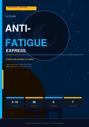 Le Plan Anti-Fatigue Express est un guide pratique pour rester performant après une nuit courte. En quelques pages denses et actionnables, tu découvres quoi manger avant et après un sommeil court, comment activer ton corps en 5 à 10 minutes dès le réveil, les erreurs classiques qui aggravent la fatigue (alcool, café trop tôt, sucre), et un plan concret sur 7 jours pour intégrer tous les outils. Idéal pour : toute personne dont les nuits sont trop courtes et qui veut reprendre le contrôle de ses journées dès le lendemain matin.