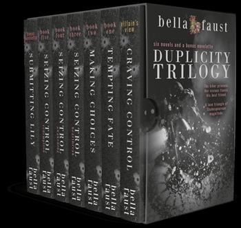 THE COMPLETE DUPLICITY TRILOGY (INCLUDING A BONUS NOVELETTE) IS NOW AVAILABLE TO BINGE READ! That's six books of realistically dark traudemption romance, brimming with angst, betrayal, and lust, set within a love triangle that everyone but the three stubborn souls involved saw coming years ago. Full of intense emotional themes that dark romance readers adore, including forbidden, age gap, love triangle/why choose, strong heroine, fake relationship, obsessed hero, arranged marriage, and second chance tropes. If you are a fan of heartbreak and redemption, and enjoy a good grovel from your morally grey heroes, the Duplicity Trilogy will tick all of your boxes... PREQUEL: CRAVING CONTROL A prequel told from the villain's point-of-view. Lies. Stalking. Blackmail. Alexander Kingsley is a master of them all… Previously banned, this 90,000-word dark and steamy psychosexual thriller is the prequel to Bella Faust's Duplicity Trilogy. BOOK ONE: TEMPTING FATE Book one in the Duplicity Trilogy. The biker princess. Her vicious fiancé. His best friend. A love triangle of Shakespearean magnitude. BOOK TWO: MAKING CHOICES Book two in the Duplicity Trilogy. A secret exposed. Loyalties divided. Stubborn denials issued. Bad decisions with Faustian consequences. BOOK THREE: SEIZING CONTROL (HEARTBREAK) Book three in the Duplicity Trilogy. A shattered heart. Promises broken. Regrets abound. Their love is a death sentence. BOOK FOUR: SEIZING CONTROL (AWAKENING) Book four in the Duplicity Trilogy. The biker princess. Her vicious fiancé. His best friend. A love triangle of Shakespearean magnitude. BOOK FIVE: SEIZING CONTROL (REDEMPTION) Book five in the Duplicity Trilogy. A secret exposed. Loyalties divided. Stubborn denials issued. Bad decisions with Faustian consequences. BONUS NOVELETTE: SUBMITTING LILY A bonus novelette told from Lily, Slash, Lazarus' points-of-view. It's the night before Christmas and all through the house, not a person is stirring… except for Lily's husband and her first love. The two men are on a mission, one that the woman they love outlined in a letter more than a year before. At the time, Lily believed she was purging her thoughts in an attempt to grieve the impossibility of loving two men, different but equal. Tonight, Slash and Lazarus will make that dream a reality. A down and dirty reality. Reader discretion is advised, as this dark traudemption romance saga contains potentially triggering content. Please also be aware that this story is set in Australia and is written in UK English with liberal use of Aussie slang and vernacular.