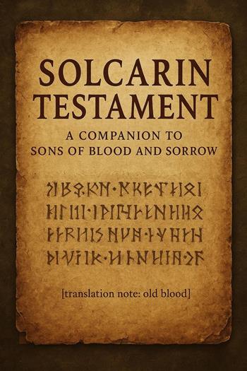 The forbidden Solcarin Testament — whispered among scholars, feared by cultists, and buried for centuries — is finally revealed. Within these ancient tablets, bloodlines are traced, prophecies are recorded, and the pulse of an old power beats through armored sleep. Discover the fragments of a world long forgotten and the subtle echoes of a Knight who should have been dead. This companion to Sons of Blood and Sorrow sets the stage for the next chapter of the saga. Translator's notes and bracketed fragments reveal the lost history of Solcarin, the precursors of Frostholt and Aethalgard, and foreshadow events that will unfold in the coming installment.