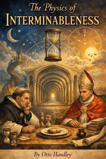 At a dinner in Orvieto, Pope Urban IV shouts at Thomas Aquinas to pass the involtini. Whether this incident actually occurred is doubtful. Whether it matters is even less clear. And yet the delay—the dish hovering eternally between hands—refuses to end. From this trivial, possibly apocryphal incident unfolds The Physics of Interminableness, a philosophical satire and narrative inquiry into why so many things in modern life never conclude. Across twenty meticulously digressive chapters, Otto Handley follows the involtini as it gathers unexpected mass, drawing in theologians, bureaucrats, physicists, monks, committees, crowds, forms, footnotes, and infinite feeds. Zeno's paradoxes invade the dining room. Language learns to postpone endings. Technology accelerates everything except arrival. For readers of Beckett, Kafka, Bernhard, and institutional satire, Otto Handley offers a work that is as funny as it is exacting—a meditation on delay, attention, and the strange endurance of unfinished things.
