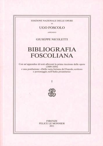 La "Bibliografia foscoliana", in 2 volumi, viene a completare l'Edizione Nazionale delle "Opere" di Ugo Foscolo pubblicata dalla casa editrice Le Monnier a partire dal 1951 e si configura come uno strumento al servizio degli studiosi del poeta dei "Sepolcri". La principale novità consiste nella primaria partizione tematica (da Guide bibliografiche per un primo orientamento, a La critica dei contemporanei, da Studi critici sulla formazione veneziana e le poesie giovanili a Rapporti e paralleli con altri scrittori, ecc.), a sua volta organizzata al suo interno in senso cronologico, mentre un ricco apparato di indice permette un facile orientamento tra le migliaia di titoli citati. Il secondo tomo raccoglie testi volti a documentare la prima ricezione dell'opera foscoliana, che, coprendo l'arco cronologico 1809-1850, ne dimostrano l'immediata fortuna europea. Chiude il volume la postfazione di Giuseppe Nicoletti "Della varia fortuna del Foscolo", scrittore e personaggio, nell'Italia preunitaria.