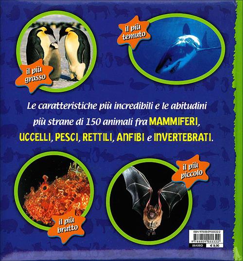 Qual è l'animale più grande del pianeta? Qual è il più piccolo? E quale corre più veloce di tutti gli altri? Tutte le risposte si trovano in questo libro sui record degli animali, realizzato per i più piccoli, con tante schede didattiche arricchite da divertenti foto. Le peculiarità di ogni record vengono descritte attraverso box illustrati dove le prestazioni degli animali sono paragonate ad un oggetto, un elemento o una situazione della vita di tutti i giorni. Età di lettura: da 6 anni.