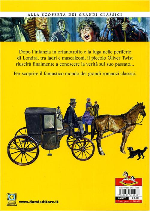 "Alla scoperta dei grandi classici" è una collana che, in una moderna versione, ripropone i classici d'avventura per ragazzi, con belle illustrazioni a colori. Una lettura stimolante e avvincente che vi accompagnerà in una nuova avventura ad ogni lettura. In questo libro vi immergerete nelle avventure del piccolo Oliver Twist, che, dopo l'infanzia in orfanotrofio e la fuga nelle periferie di Londra, tra ladri e mascalzoni, riuscirà finalmente a conoscere la verità sul suo passato. Età di lettura: da 8 anni.