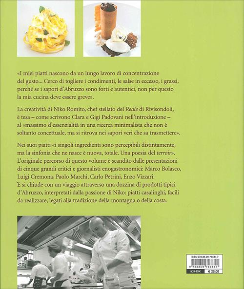 Ricette raffinate, preparazioni semplicemente perfette per chiunque voglia cimentarsi con la cucina d'autore. Niko non pensava certo di ritirarsi nelle cucine di Rivisondoli dove il padre aveva aperto prima una pasticceria e poi una trattoria dove il ragazzo veniva ad aiutarlo nei momenti liberi. Poi dopo un percorso duro e faticoso che lo metterà in contatto con grandi chef italiani e spagnoli individua il suo stile che coniuga tecnica e materia. Una cucina nata proprio dalla tradizione della sua terra essenziale ma dolce, aspra ma suggestiva.