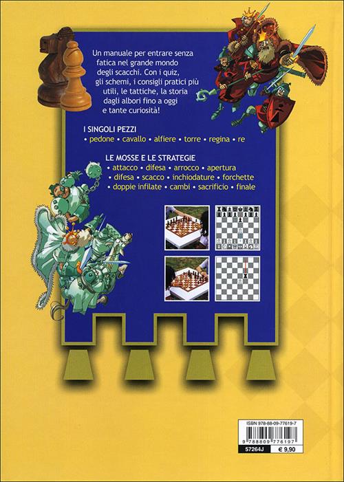 Una nuova edizione del manuale degli scacchi, con in più la scacchiera e i pezzi da ritagliare e montare, per mettere subito in pratica il gioco. Un libro colorato, per entrare senza fatica nel grande mondo degli scacchi con i quiz, gli schemi, i consigli pratici più utili, le tattiche, la storia dagli albori fino a oggi e tante curiosità. Tutto sui singoli pezzi - pedone, cavallo, alfiere, torre, regina, re - e sulle mosse e le strategie - attacco, difesa, arrocco, apertura, difesa, attacco, inchiodature, forchette, doppie infilate, cambi, sacrificio, finale. Età di lettura: da 8 anni.