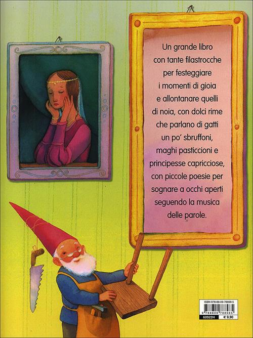 Un libro con tante filastrocche per festeggiare i momenti di gioia e allontanare quelli di noia, con dolci rime che parlano di gatti un po' sbruffoni, maghi pasticcioni e principesse capricciose, con piccole poesie per sognare a occhi aperti seguendo la musica delle parole. Oltre 200 filastrocche suddivise in 7 sezioni dedicate agli argomenti più vari: i regni incantati, le fiabe, gli animali, il tempo, le feste, le emozioni, rime per imparare. Ogni momento della giornata, ogni evento, ogni ricorrenza ha la sua filastrocca... basta solo cercarla. Età di lettura: da 3 anni.