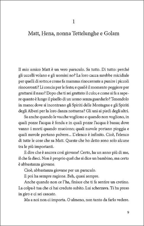 Quattro bambini in cammino sotto il cielo africano, in un mondo dove la natura e le cose sono ancora permeate dagli Spiriti di cui nonna Tettelunghe racconta le storie più spaventose e affascinanti. Teneri e ficcanaso, Kimo, Matt, Golam e Hena vivono i cambiamenti delle tradizioni del villaggio con la meraviglia e la spensieratezza tipiche della loro età. Raccontata con occhi spalancati e irriducibile umorismo dal più ingenuo, dolce e curioso dei quattro bambini, questa è la storia di un'innocenza violata, la testimonianza del dramma di un intero continente.