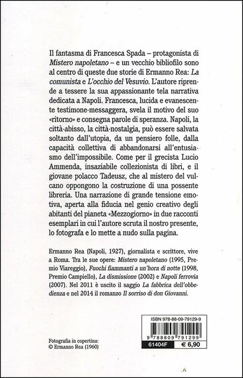 Due racconti esemplari in cui l'autore, fedele ai suoi temi più cari, con sguardo acuto e fermo scruta il nostro presente e lo fotografa, lo mette a nudo sulla pagina in uno stile terso e pulito, "perfetto". Napoli e la sua gente, il presente e il passato di una città e di un'intera nazione affamate di speranza e di futuro. Ermanno Rea torna con "La comunista" sui suoi passi, torna a Mistero napoletano, ma il personaggio che ci presenta non è più, come in quel vecchio romanzo, una donna in carne e ossa, bensì il suo fantasma, una creatura evanescente anche se, a momenti, terribilmente reale, capace di parlare, sorridere, piangere, come quando era viva e colmava ogni possibile vuoto con la sua incontenibile esuberanza. Anche adesso, benché fantasma, Francesca riempie di sé la scena del racconto, svelando pian piano la ragione del suo "ritorno" a Napoli. Anche "L'occhio del Vesuvio" è una storia che ha, a sua volta, i colori e lo spessore dell'allucinazione. La trama è lineare, benché sovrastata dalla presenza minacciosa del Vesuvio, trasformato esso stesso in attore, personaggio neppure troppo secondario della vicenda. Distruggerà Napoli? La domanda è ripetutamente evocata, soprattutto dal co-protagonista del racconto, il grecista Lucio Ammenda, insaziabile e disordinato collezionista di libri, parte dei quali dedicati proprio al "formidabil-monte" e ai suoi misteri.