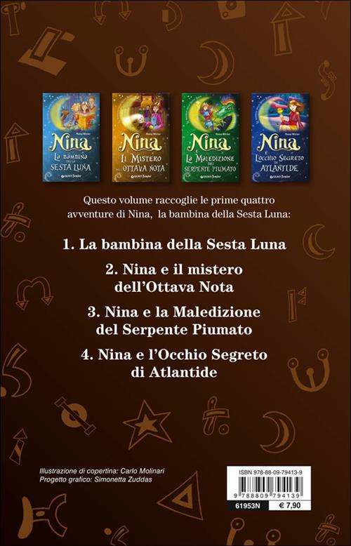 La magia non basta più. È arrivata Nina, la bambina della Sesta Luna. Fa la quinta elementare, ha una storia comune a quella di tanti ragazzi della sua età, ma c'è una strana voglia a forma di stella sulla sua mano destra... assolutamente identica a quella dell'amato nonno Misha, che vive a Venezia ed è un alchimista. Proprio quella stella è un segno del destino che aspetta Nina, un futuro che comincia improvvisamente, una notte, quando il nonno muore in modo misterioso. Nina raggiunge Venezia, accompagnata dal suo cane Adone e dal gatto Platone, pronta a capire cosa stia succedendo. Per intraprendere questa avventura contro il perfido conte Karkon Ca' d'Oro e contro i suoi bambini androidi, trova dei fidi compari in quattro piccoli veneziani, già amici del nonno. Ecco, l'avventura è al suo inizio... Un viaggio fantastico tra alchimia e magia, una storia appassionante per i ragazzi che amano il mistero, ora raccolta in un unico volume. Età di lettura: da 8 anni.