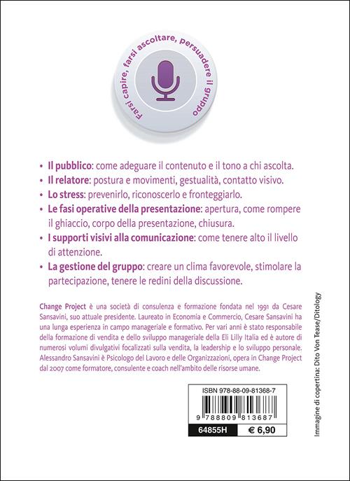 Parlare in pubblico è un'abilità indispensabile in qualsiasi azienda moderna. Un bravo relatore non è soltanto un abile oratore, ma è colui che sa trasmettere innovazione, dinamismo e ottimismo grazie alla sua forza di persuasione. Questo libro si rivolge a tutti i manager, i formatori, i docenti e, più in generale, a quanti nella vita privata come nel lavoro considerano indispensabile far arrivare agli altri il proprio messaggio.