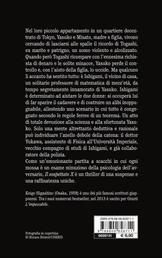 Dopo il divorzio da un uomo violento, Yasuko cresce da sola la figlia Misato e cerca di rifarsi una vita indipendente, tenendo lontani gli errori del passato. Quando l'ex marito si presenta alla sua porta per estorcerle del denaro, minacciando sia lei che la figlia, Yasuko perde il controllo e lo uccide strangolandolo con un cavo. Il vicino di casa, il signor Ishigami, un meticoloso professore di matematica di mezz'età, ha sentito tutto e, invece di denunciare l'accaduto, si offre di aiutare Yasuko, a patto che lei e la figlia seguano alla lettera i suoi ordini. L'insospettabile matematico ha un piano degno della sua professione in cui niente è lasciato al caso: si occupa del cadavere e costruisce per le due donne un alibi inappuntabile. Ma l'investigatore Kusanagi, a cui viene affidato il caso, capisce immediatamente di aver bisogno d'aiuto e si rivolge all'infallibile dottor Yukawa, alias Galileo, un fisico che collabora con la polizia. Lo scienziato intuisce che il delitto nasconde qualcosa di molto anomalo e che qualcuno sta cercando ingegnosamente di depistare le indagini.