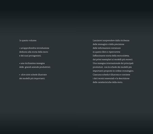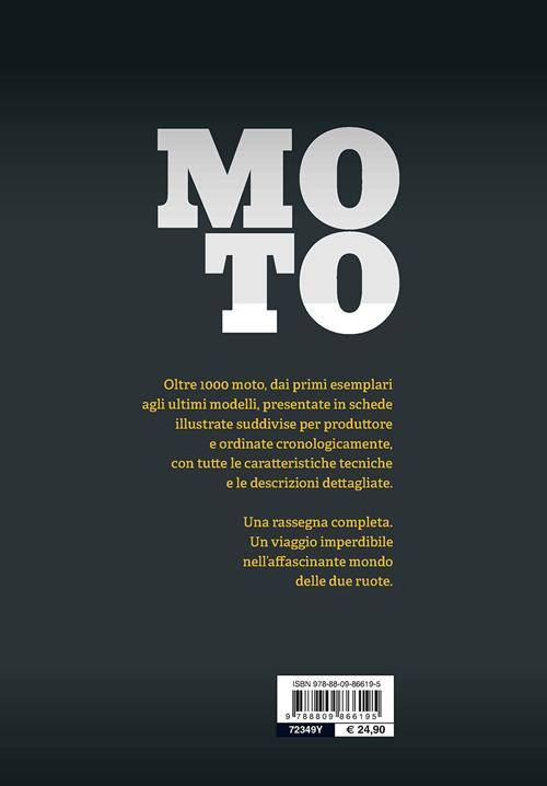 Lasciatevi sorprendere dalla ricchezza delle immagini e dalla precisione delle informazioni contenute in questo libro e ripercorrete l'affascinante storia della motocicletta, dai primi esemplari ai modelli più recenti. Una rassegna internazionale dei principali produttori, con le schede dei modelli più importanti proposte in ordine cronologico. Ciascuna scheda è illustrata e contiene i dati tecnici essenziali e la descrizione delle caratteristiche della moto.
