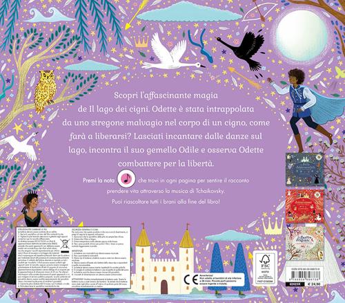 Scopri l'affascinante magia de Il lago dei cigni. In ogni pagina si può premere un pulsante e sentire la musica originale che accompagna la romantica storia della bellissima Odette, una principessa condannata da un perfido mago a trasformarsi in cigno durante il giorno. Solo un giuramento d'amore potrà liberarla e ci riuscirà il principe Sigfried che si è perdutamente innamorato di lei. Tutti i brani si possono poi ascoltare anche nella pagina finale ricca di informazioni sul compositore e la sua musica. Età di lettura: da 3 anni.