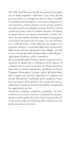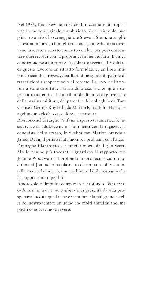 Nel 1986, insieme al suo più caro amico, lo sceneggiatore Stewart Stern, Paul Newman dà inizio a un progetto unico e originale: raccogliere in volume tutti i ricordi che su di lui conservavano familiari, amici, colleghi. Per ciascuno di essi, poi, lo stesso Paul Newman racconterà la propria versione della storia. L’unico regola stabilita per tutti è l’assoluta sincerità. Il progetto va avanti per cinque anni, e il risultato è questo racconto profondo e ricco di rivelazioni, distillato di migliaia di pagine di trascrizioni. Rivivono nel dettaglio la turbolenta vita giovanile, le sue insicurezze di adolescente e le prime difficoltà con le donne; i successi sul grande schermo, la rivalità con Marlon Brando e James Dean, e la consacrazione a star mondiale. Non mancano inoltre le confessioni sul primo matrimonio, sui problemi con l’alcol e sulla morte prematura del figlio Scott. Ma soprattutto, al centro del libro, il commovente e inedito racconto della relazione con Joanne Woodward, il loro forte amore reciproco ma anche il fondamentale sostegno intellettuale ed emotivo che lei ha rappresentato. La voce di Paul Newman è spesso divertita, a tratti dolorosa, sempre potente e sincera, e le fanno da contraltare i ricordi degli amici d’infanzia e della marina militare, dei familiari e dei colleghi del cinema e del teatro – da Tom Cruise a George Roy Hill fino a John Huston – che rendono La vita straordinaria di un uomo ordinario allo stesso tempo un libro ricco di rivelazioni e introspettivo, intimo e onesto, profondo e mai banale.