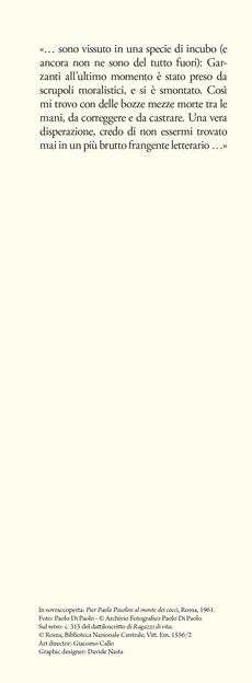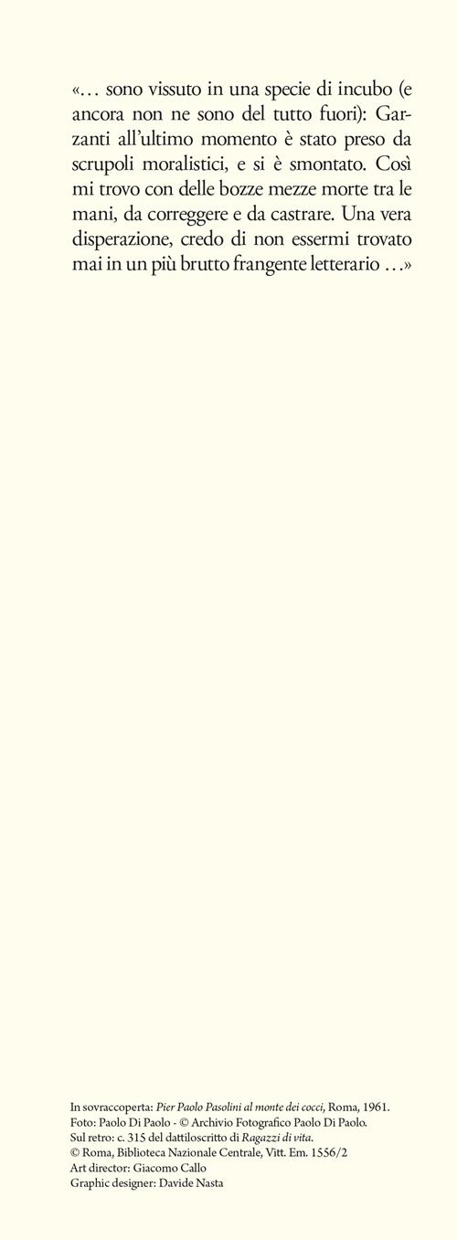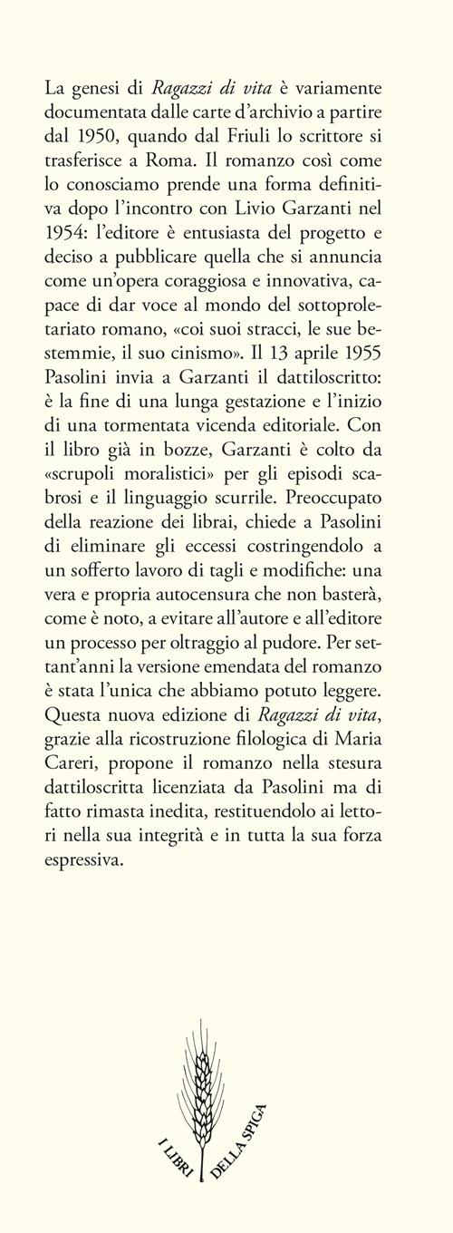 La genesi di "Ragazzi di vita" è variamente documentata dalle carte d'archivio a partire dal 1950, quando dal Friuli lo scrittore si trasferisce a Roma. Il romanzo così come lo conosciamo prende una forma definitiva dopo l'incontro con Livio Garzanti nel 1954: l'editore è entusiasta del progetto e deciso a pubblicare quella che si annuncia come un'opera coraggiosa e innovativa, capace di dar voce al mondo del sottoproletariato romano, «coi suoi stracci, le sue bestemmie, il suo cinismo». Il 13 aprile 1955 Pasolini invia a Garzanti il dattiloscritto: è la fine di una lunga gestazione e l'inizio di una tormentata vicenda editoriale. Con il libro già in bozze, Garzanti è colto da «scrupoli moralistici» per gli episodi scabrosi e il linguaggio scurrile. Preoccupato della reazione dei librai, chiede a Pasolini di eliminare gli eccessi costringendolo a un sofferto lavoro di tagli e modifiche: una vera e propria autocensura che non basterà, come è noto, a evitare all'autore e all'editore un processo per oltraggio al pudore. Per settant'anni la versione emendata del romanzo è stata l'unica che abbiamo potuto leggere.