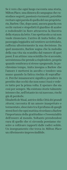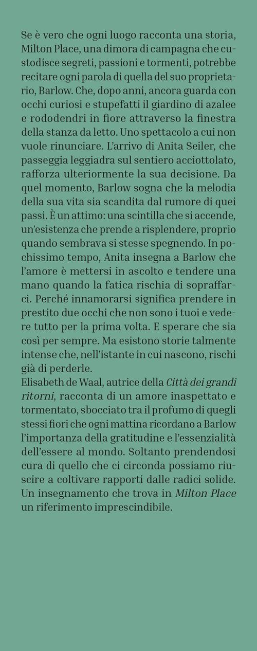 Se è vero che ogni luogo racconta una storia, Milton Place, una dimora di campagna che custodisce segreti, passioni e tormenti, potrebbe recitare ogni parola di quella del suo proprietario, Barlow. Che, dopo anni, ancora guarda con occhi curiosi e stupefatti il giardino di azalee e rododendri in fiore attraverso la finestra della stanza da letto. Uno spettacolo a cui non vuole rinunciare. L'arrivo di Anita Seiler, che passeggia leggiadra sul sentiero acciottolato, rafforza ulteriormente la sua decisione. Da quel momento, Barlow sogna che la melodia della sua vita sia scandita dal rumore di quei passi. È un attimo: una scintilla che si accende, un'esistenza che prende a risplendere, proprio quando sembrava si stesse spegnendo. In pochissimo tempo, Anita insegna a Barlow che l'amore è mettersi in ascolto e tendere una mano quando la fatica rischia di sopraffarci. Perché innamorarsi significa prendere in prestito due occhi che non sono i tuoi e vedere tutto per la prima volta. E sperare che sia così per sempre. Ma esistono storie talmente intense che, nell'istante in cui nascono, rischi già di perderle.