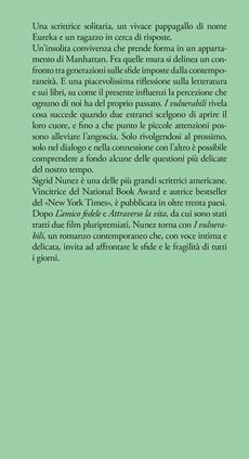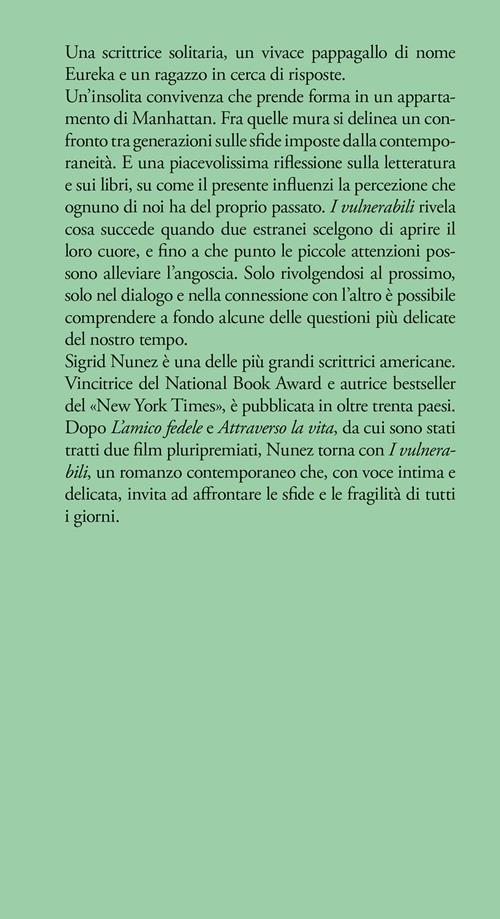 Una scrittrice solitaria, un vivace pappagallo di nome Eureka e un ragazzo in cerca di risposte. Un'insolita convivenza che prende forma in un appartamento di Manhattan. Fra quelle mura si delinea un confronto tra generazioni sulle sfide imposte dalla contemporaneità. E una piacevolissima riflessione sulla letteratura e sui libri, su come il presente influenzi la percezione che ognuno di noi ha del proprio passato. "I vulnerabili" rivela cosa succede quando due estranei scelgono di aprire il loro cuore, e fino a che punto le piccole attenzioni possono alleviare l'angoscia. Solo rivolgendosi al prossimo, solo nel dialogo e nella connessione con l'altro è possibile comprendere a fondo alcune delle questioni più delicate del nostro tempo.