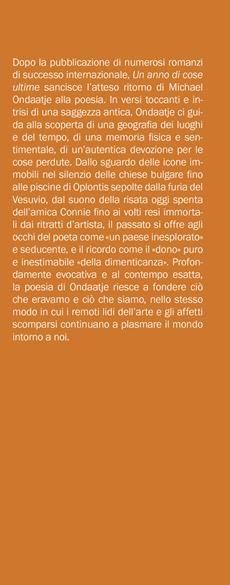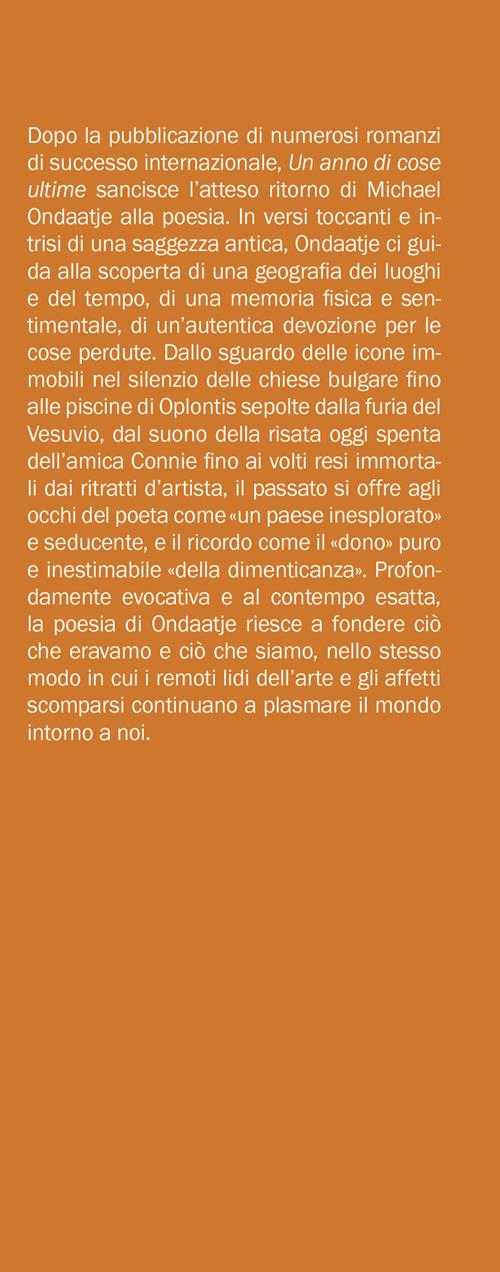 Dallo sguardo delle icone immobili nel silenzio delle chiese bulgare fino alle piscine di Oplontis sepolte dalla furia del Vesuvio, dal suono della risata oggi spenta dell’amica Connie fino ai volti resi immortali dai ritratti d’artista, il passato si offre agli occhi del poeta come «un paese inesplorato» e seducente, e il ricordo come il «dono» puro e inestimabile «della dimenticanza». Profondamente evocativa e al contempo esatta, la poesia di Ondaatje riesce a fondere ciò che eravamo e ciò che siamo, nello stesso modo in cui i remoti lidi dell’arte e gli affetti scomparsi continuano a plasmare il mondo intorno a noi.