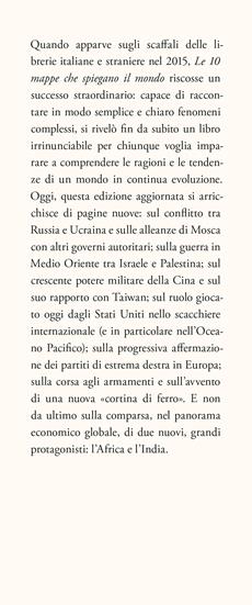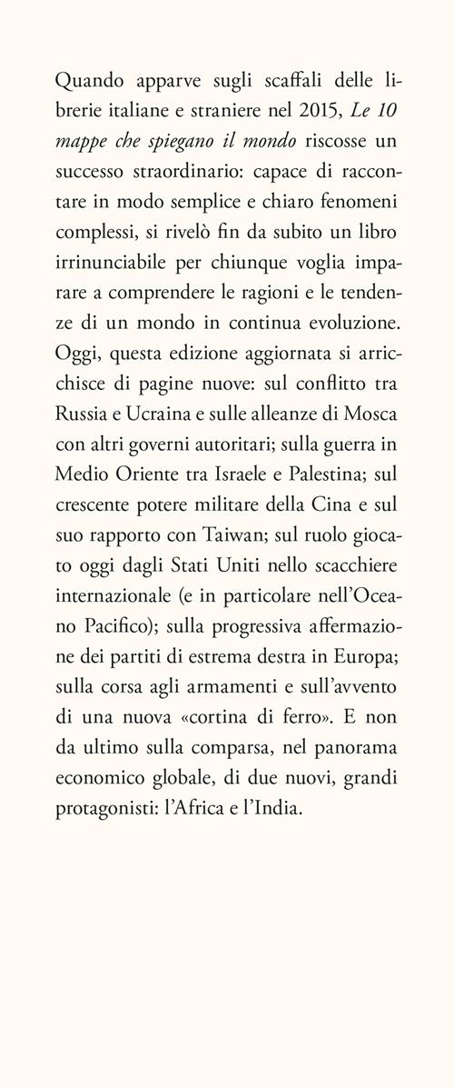 Quando apparve sugli scaffali delle librerie italiane e straniere nel 2015, Le 10 mappe che spiegano il mondo riscosse un successo straordinario: capace di raccontare in modo semplice e chiaro fenomeni complessi, si rivelò fin da subito un libro irrinunciabile per chiunque voglia imparare a comprendere le ragioni e le tendenze di un mondo in continua evoluzione. Oggi, questa edizione aggiornata si arricchisce di pagine nuove: sul conflitto tra Russia e Ucraina e sulle alleanze di Mosca con altri governi autoritari; sulla guerra in Medio Oriente tra Israele e Palestina; sul crescente potere militare della Cina e sul suo rapporto con Taiwan; sul ruolo giocato oggi dagli Stati Uniti nello scacchiere internazionale (e in particolare nell'Oceano Pacifico); sulla progressiva affermazione dei partiti di estrema destra in Europa; sulla corsa agli armamenti e sull'avvento di una nuova «cortina di ferro». E non da ultimo sulla comparsa, nel panorama economico globale, di due nuovi, grandi protagonisti: l'Africa e l'India.