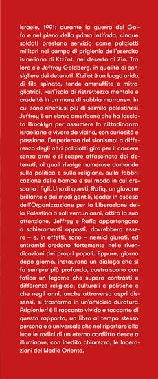 Israele, 1991: durante la guerra del Golfo e nel pieno della prima Intifada, cinque soldati prestano servizio come poliziotti militari nel campo di prigionia dell'esercito israeliano di Ktzi'ot, nel deserto di Zin. Tra loro c'è Jeffrey Goldberg, in qualità di consigliere dei detenuti. Ktzi'ot è un luogo arido, di filo spinato, tende ammuffite e mitragliatrici, «un'isola di ristrettezza mentale e crudeltà in un mare di sabbia marrone», in cui sono rinchiusi più di seimila palestinesi. Jeffrey è un ebreo americano che ha lasciato Brooklyn per assumere la cittadinanza israeliana e vivere da vicino, con curiosità e passione, l'esperienza del sionismo: a differenza degli altri poliziotti gira per il carcere senza armi e si scopre affascinato dai detenuti, ai quali rivolge numerose domande sulla politica e sulla religione, sulla fabbricazione delle bombe e sul modo in cui crescono i figli. Uno di questi, Rafiq, un giovane brillante e dai modi gentili, leader in ascesa dell'Organizzazione per la Liberazione della Palestina a soli ventun anni, attira la sua attenzione. Jeffrey e Rafiq appartengono a schieramenti opposti, dovrebbero essere – e, in effetti, sono – nemici giurati, ed entrambi credono fortemente nelle rivendicazioni dei propri popoli. Eppure, giorno dopo giorno, instaurano un dialogo che si fa sempre più profondo, costruiscono con fatica un legame che supera contrasti e differenze religiose, culturali e politiche e che negli anni, anche attraverso aspri dissensi, si trasforma in un'amicizia duratura. "Prigionieri" è il racconto vivido e toccante di questo rapporto, un libro al tempo stesso personale e universale che nel riportare alla luce le radici di un eterno conflitto riesce a illuminare, con inedita chiarezza, le lacerazioni del Medio Oriente.