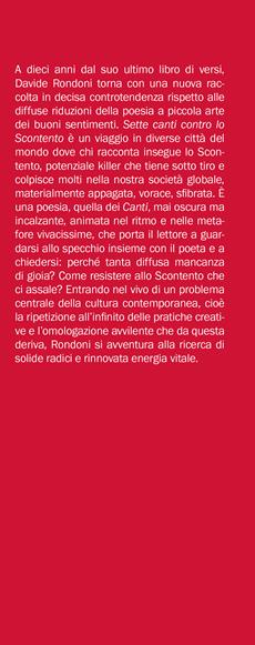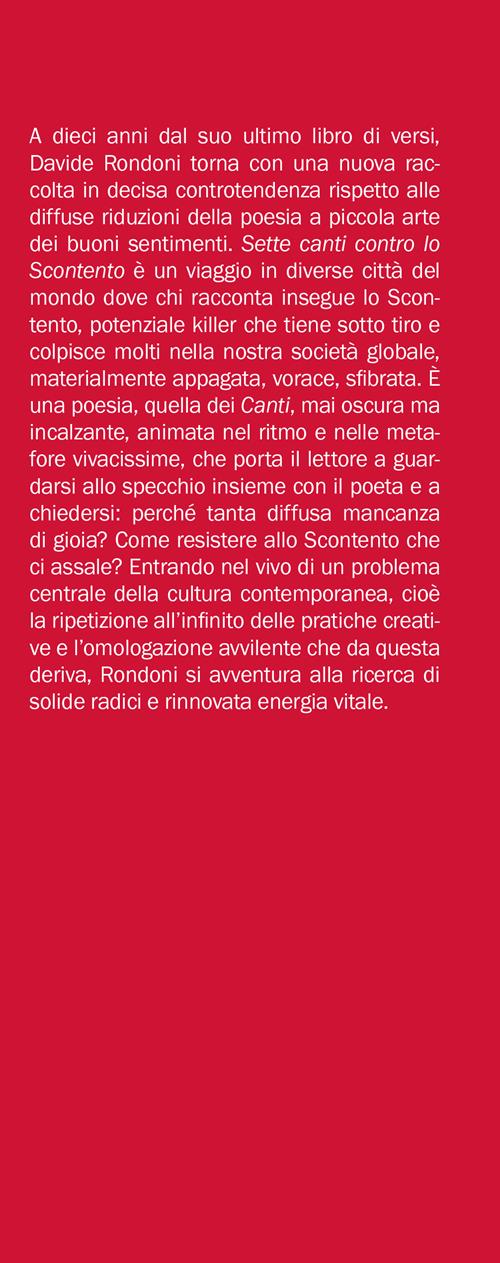 A dieci anni dal suo ultimo libro di versi, Davide Rondoni torna con una nuova raccolta in decisa controtendenza rispetto alle diffuse riduzioni della poesia a piccola arte dei buoni sentimenti. Sette canti contro lo Scontento è un viaggio in diverse città del mondo dove chi racconta insegue lo Scontento, potenziale killer che tiene sotto tiro e colpisce molti nella nostra società globale, materialmente appagata, vorace, sfibrata. È una poesia, quella dei Canti , mai oscura ma incalzante, animata nel ritmo e nelle metafore vivacissime, che porta il lettore a guardarsi allo specchio insieme con il poeta e a chiedersi: perché tanta diffusa mancanza di gioia? Come resistere allo Scontento che ci assale?