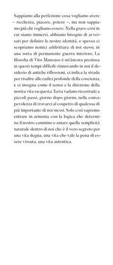Sappiamo alla perfezione cosa vogliamo avere - ricchezza, piacere, potere - ma non sappiamo più chi vogliamo essere . Nella grave crisi in cui siamo immersi, necessitiamo continuamente di avversari per definire le nostre identità, e spesso ci scopriamo nemici addirittura di noi stessi, in una sorta di permanente guerra interiore. La filosofia di Vito Mancuso è un'àncora preziosa in questi tempi difficili: rinnovando in noi il desiderio di antiche riflessioni, ci indica la strada per risalire alle radici profonde della nostra coscienza, e ci insegna come il senso e la direzione della nostra vita su questa Terra vadano ricostruiti a piccoli passi, giorno dopo giorno, nella consapevolezza di trovarci al cospetto di qualcosa di più importante di noi stessi. Solo così sapremo entrare in armonia con la logica che determina il nostro cammino e amare quella semplicità naturale dentro di noi che è il vero segreto per una vita degna, una vita che vale la pena vivere, una vita autentica.