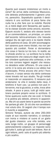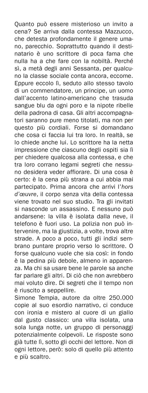 Quanto può essere misterioso un invito a cena? Se arriva dalla contessa Mazzucco, che detesta profondamente il genere umano, parecchio. Soprattutto quando il destinatario è uno scrittore di poca fama che nulla ha a che fare con la nobiltà. Perché sì, a metà degli anni Sessanta, per qualcuno la classe sociale conta ancora, eccome. Eppure eccolo lì, seduto alla stessa tavola con un commendatore, un principe, un uomo dall'accento latino-americano che trasuda sangue blu da ogni poro e la nipote ribelle della padrona di casa. Gli altri accompagnatori saranno pure meno titolati, ma non per questo più cordiali. Forse si domandano che cosa ci faccia lui tra loro. In realtà, se lo chiede anche lui. Lo scrittore ha la netta impressione che ciascuno degli ospiti sia lì per chiedere qualcosa alla contessa, e che tra loro corrano legami segreti che nessuno desidera veder affiorare. Di una cosa è certo: è la cena più strana a cui abbia mai partecipato. Prima ancora che arrivi l'hors d'œuvre, il corpo senza vita della contessa viene trovato nel suo studio. Tra gli invitati si nasconde un assassino. E nessuno può andarsene: la villa è isolata dalla neve, il telefono è fuori uso. La polizia non può intervenire, ma la giustizia, a volte, trova altre strade. A poco a poco, tutti gli indizi sembrano puntare proprio verso lo scrittore. O forse qualcuno vuole che sia così: in fondo è la pedina più debole, almeno in apparenza. Ma chi sa usare bene le parole sa anche far parlare gli altri. Di ciò che non avrebbero mai voluto dire. Di segreti che il tempo non è riuscito a seppellire.