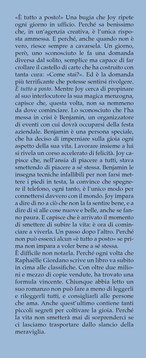 «È tutto a posto!» Una bugia che Joy ripete ogni giorno in ufficio. Perché sa benissimo che, in un'agenzia creativa, è l'unica risposta ammessa. E perché, anche quando non è vero, riesce sempre a cavarsela. Un giorno, però, uno sconosciuto le fa una domanda diversa dal solito, semplice ma capace di far crollare il castello di carte che ha costruito con tanta cura: «Come stai?». Ed è la domanda più terrificante che potesse sentirsi rivolgere. È tutto a posto. Mentre Joy cerca di propinare al suo interlocutore la sua magica menzogna, capisce che, questa volta, non sa nemmeno da dove cominciare. Lo sconosciuto che l'ha messa in crisi è Benjamin, un organizzatore di eventi con cui dovrà occuparsi della festa aziendale. Benjamin è una persona speciale, che ha deciso di imperniare sulla gioia ogni aspetto della sua vita. Lavorare insieme a lui si rivela un corso accelerato di felicità. Joy capisce che, nell'ansia di piacere a tutti, stava smettendo di piacere a sé stessa. Benjamin le insegna tecniche infallibili per non farsi mettere i piedi in testa, la convince che spegnere il telefono, ogni tanto, è l'unico modo per connettersi davvero con il mondo. Joy impara a dire di no a ciò che non la fa sentire bene, e a dire di sì alle cose nuove e belle, anche se fanno paura. E capisce che è arrivato il momento di smettere di subire la vita: è ora di cominciare a viverla. Un passo dopo l'altro. Perché non può esserci alcun «è tutto a posto» se prima non impara a voler bene a sé stessa.