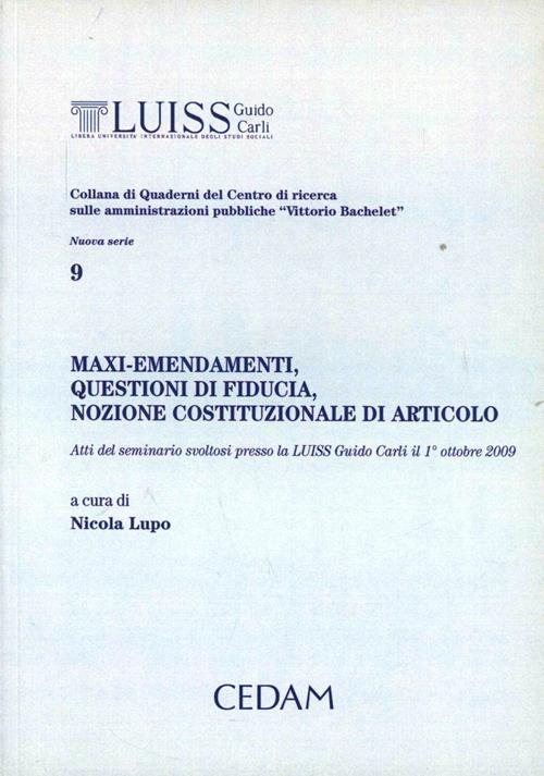 Il presente quaderno contiene gli atti del seminario di studi su "Maxi-emendamenti e questione di fiducia: esiste una nozione costituzionale di articolo?", organizzato il 1° ottobre 2009 presso la Luiss "Guido Carli" dal Centro di studi sul Parlamento e dal Centro di ricerca sulle amministrazioni pubbliche "Vittorio Bachelet", insieme al Dipartimento di Scienze giuridiche, cui tali Centri sono strutturalmente collegati. In considerazione della stringente attualità e delle dimensioni assai cospicue (mostrate, con evidenza, dai dati riportati e discussi in appendice) del fenomeno, quello dei maxi-emendamenti su cui il Governo pone la questione di fiducia, discusso nel seminario, traendo spunto dal lavoro monografico di Giovanni Piccirilli si è deciso di pubblicare questa raccolta degli interventi del Seminario alla luce soprattutto della lacuna degli studi costituzionalistici in materia derivante forse dalla complessità tecnico-procedurale del tema e dalla "cattiva stampa" di cui gli emendamenti hanno spesso goduto.