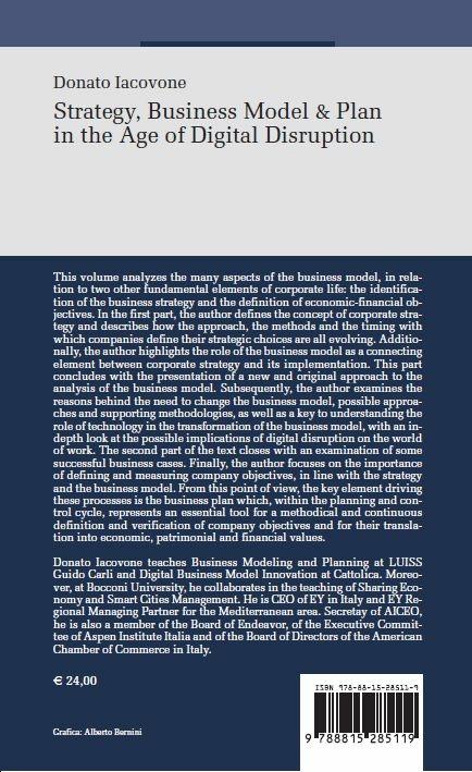 This volume analyzes the many aspects of the business model, in relation to two other fundamental elements of corporate life: the identification of the business strategy and the definition of economic-financial objectives. In the first part, the author defines the concept of corporate strategy and describes how the approach, the methods and the timing with which companies define their strategic choices are all evolving. Additionally, the author highlights the role of the business model as a connecting element between corporate strategy and its implementation. This part concludes with the presentation of a new and original approach to the analysis of the business model. Subsequently, the author examines the reasons behind the need to change the business model, possible approaches and supporting methodologies, as well as a key to understanding the role of technology in the transformation of the business model, with an indepth look at the possible implications of digital disruption on the world of work. The second part of the text closes with an examination of some successful business cases. Finally, the author focuses on the importance of defining and measuring company objectives, in line with the strategy and the business model. From this point of view, the key element driving these processes is the business plan which, within the planning and control cycle, represents an essential tool for a methodical and continuous definition and verification of company objectives and for their translation into economic, patrimonial and financial values.