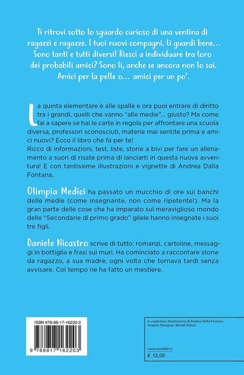 La quinta elementare è alle spalle e ora puoi entrare di diritto tra i grandi, quelli che vanno "alle medie"... giusto? Ma come fai a sapere se hai le carte in regola per affrontare una scuola diversa, professori sconosciuti, materie mai sentite prima e amici nuovi? Ecco il libro che fa per te! Ricco di informazioni, test, liste, storie a bivi per fare un allenamento a suon di risate prima di lanciarti in questa nuova avventura! E con tantissime illustrazioni e vignette di Andrea Dalla Fontana.