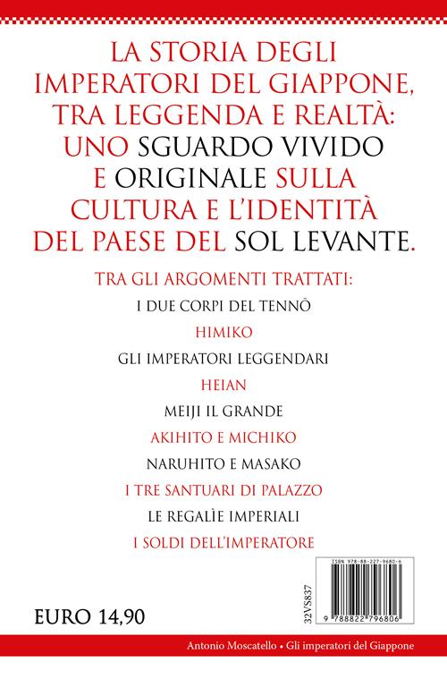 La storia degli imperatori del Giappone, tra leggenda e realtà: uno sguardo vivido e originale sulla cultura e l'identità del paese del Sol Levante. Tra gli argomenti trattati: I due corpi del Tennō Himiko Gli imperatori leggendari Heian Meiji il Grande Akihito e Michiko Naruhito e Masako I tre santuari di palazzo Le regalìe imperiali I soldi dell'imperatore Storia e segreti della dinastia più antica del mondo Quanto conta oggi il Trono del Crisantemo, occupato dagli imperatori che simboleggiano da una remota antichità lo spirito più profondo del Giappone? Antonio Moscatello propone un'opera unica nel suo genere, che ripercorre la storia della più antica dinastia ereditaria ancora esistente al mondo e dei suoi protagonisti. Politica, religione, mitologia e cultura si intersecano in una narrazione coinvolgente e documentata, che dai leggendari albori dell'imperatore Jinmu giunge fino ai giorni nostri. Rivivono in queste pagine figure come Suiko, promotrice del buddhismo e delle riforme alla base del moderno Stato giapponese; Go-Daigo, protagonista della lunga guerra civile in opposizione allo shogunato; Meiji, fautore della modernizzazione e occidentalizzazione del Giappone; Hirohito, controverso imperatore della seconda guerra mondiale. Questo libro, inoltre, non si limita a raccontare la storia misteriosa del Trono del Crisantemo, ma descrive rituali e funzionamento di un'istituzione che definisce l'identità giapponese, fornendo così una lente privilegiata per comprendere gli aspetti più profondi della cultura nipponica.