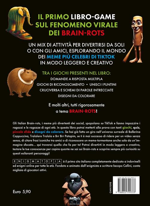 Il primo libro-game sul fenomeno virale dei Brain-rots. Il divertimento è assicurato con i meme più popolari di TikTok Un mix di attività per divertirsi da soli o con gli amici, esplorando il mondo dei meme più celebri di TikTok in modo leggero e creativo  Gli Italian Brain-rots, i meme più divertenti dei social, spopolano su TikTok e fanno impazzire i ragazzi e le ragazze di ogni età. In questo libro potrai metterti alla prova con tanti giochi, quiz, piccole sfide e disegni da colorare. Se hai già fatto un giro nell'universo surreale di Ballerina Cappuccina, Tralalero Tralala e Brr Brr Patapim, se ti è mai successo di ridere per un video senza senso, di citare frasi iconiche tra amici o di riconoscere un meme-tormentone anche solo da un'immagine sfocata... qui troverai quello che fa per te! Potrai divertirti in modo leggero e creativo, testare le tue conoscenze per capire quante ne sai sui Brain-rots e scoprire sempre più curiosità su questi esilaranti personaggi! Tra i giochi presenti nel libro: Domande a risposta multipla Giochi di riconoscimento Unisci i puntini Cruciverba e schemi di parole intrecciate Disegni da colorare ...e molti altri, tutti rigorosamente a tema Brain-rots! Età di lettura: da 10 anni.