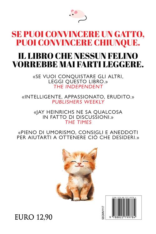 I gatti riescono a far fare agli esseri umani ciò che vogliono, quando vogliono. Quindi, se tu riuscissi a convincere un gatto a fare ciò che desideri, allora qualsiasi essere umano – collega, amico, capo, partner o persino il tuo parente più intrattabile – si inchinerebbe alla tua magia. In queste pagine Jay Heinrichs, autore pluripremiato e consulente, tra gli altri, del Pentagono e della NASA, condensa la sua esperienza in fatto di negoziazioni e retorica per mostrarti come conquistare anche il più ostinato degli avversari felini. Imparerai a: perfezionare il tuo tempismo, migliorare il linguaggio del corpo per ottenere il tono e i gesti giusti, intuire cosa vuole il tuo avversario e attirarlo facendogli credere di avere il coltello dalla parte del manico. Il risultato? Una risoluzione felice. E, si spera, senza graffi...