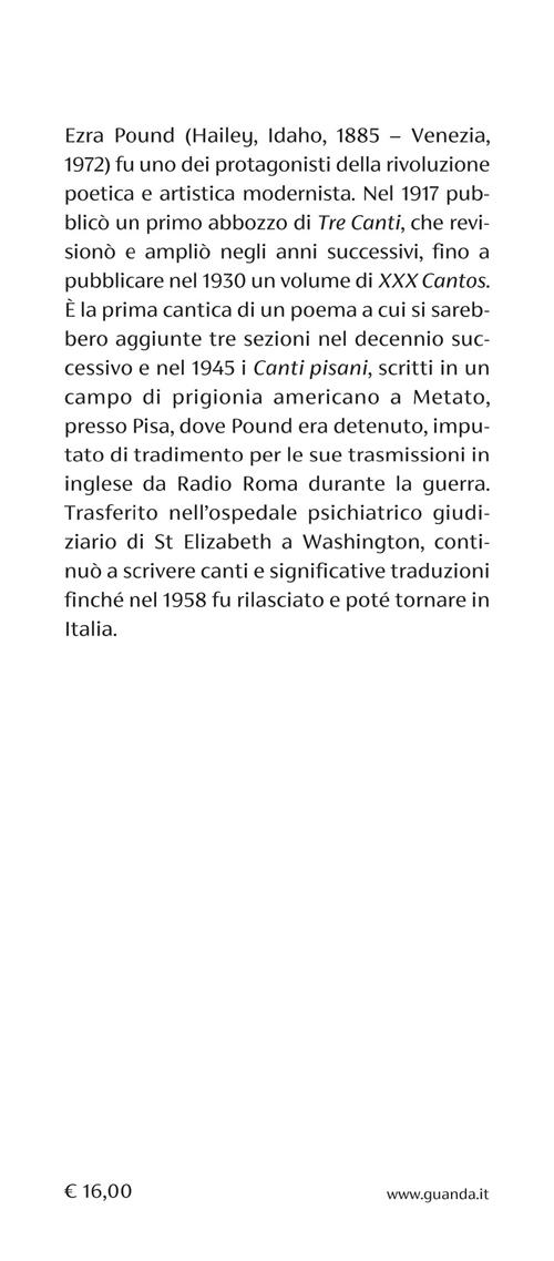 Come Byron ai primi dell'Ottocento, Ezra Pound inaugura il Modernismo novecentesco con un viaggio poetico lungo le coste del Mediterraneo: da Gibilterra alla Provenza, alla Grecia omerica, all'Italia del Rinascimento e di scabri paesaggi esotici - "Come lo scultore vede la forma nell'aria..." Con qualche puntata a Parigi e a Londra, dove trova fra l'altro un Inferno contemporaneo in cui finiscono coloro "che hanno messo la voglia di denaro davanti ai piaceri dei sensi". Scritti nell'età delle avanguardie, fra scambi intensi con James Joyce e T.S. Eliot e scorribande sulle tracce di trovatori e condottieri, riuniti in volume nel 1930, i "XXX cantos" costituiscono la prima avventurosa cantica del poema a cui Pound lavorò tutta la vita, un libro compiuto in cui il passato rivissuto appassionatamente dialoga con la strage della Prima guerra mondiale e regala modelli libertari e appaganti. Questa nuova traduzione commentata consente di riscoprire una delle opere epocali del moderno, intrico di riscritture e rivelazioni, in tutta la sua corrusca freschezza e progettualità.