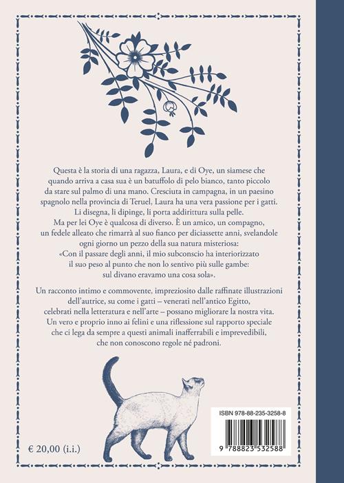 Questa è la storia di una ragazza, Laura, e di Oye, un siamese che quando arriva a casa sua è un batuffolo di pelo bianco, tanto piccolo da stare sul palmo di una mano. Cresciuta in campagna, in un paesino spagnolo nella provincia di Teruel, Laura ha una vera passione per i gatti. Li disegna, li dipinge, li porta addirittura sulla pelle. Ma per lei Oye è qualcosa di diverso. È un amico, un compagno, un fedele alleato che rimarrà al suo fianco per diciassette anni, svelandole ogni giorno un pezzo della sua natura misteriosa: «Con il passare degli anni, il mio subconscio ha interiorizzato il suo peso al punto che non lo sentivo più sulle gambe: sul divano eravamo una cosa sola». Un racconto intimo e commovente, impreziosito dalle raffinate illustrazioni dell'autrice, su come i gatti – venerati nell'antico Egitto, celebrati nella letteratura e nell'arte – possano migliorare la nostra vita.