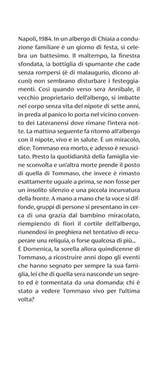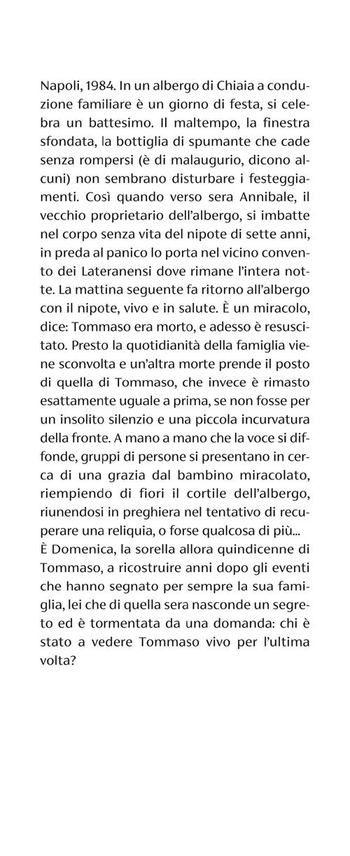 Napoli, 1984. In un albergo di Chiaia a conduzione familiare è un giorno di festa, si celebra un battesimo. Il maltempo, la finestra sfondata, la bottiglia di spumante che cade senza rompersi (è di malaugurio, dicono alcuni) non sembrano disturbare i festeggiamenti. Così quando verso sera Annibale, il vecchio proprietario dell’albergo, si imbatte nel corpo senza vita del nipote di sette anni, in preda al panico lo porta nel vicino convento dei Lateranensi dove rimane l’intera notte. La mattina seguente fa ritorno all’albergo con il nipote, vivo e in salute. È un miracolo, dice: Tommaso era morto, e adesso è resuscitato. Presto la quotidianità della famiglia viene sconvolta e un’altra morte prende il posto di quella di Tommaso, che invece è rimasto esattamente uguale a prima, se non fosse per un insolito silenzio e una piccola incurvatura della fronte. A mano a mano che la voce si diffonde, gruppi di persone si presentano in cerca di una grazia dal bambino miracolato, riempiendo di fiori il cortile dell’albergo, riunendosi in preghiera nel tentativo di recuperare una reliquia, o forse qualcosa di più... È Domenica, la sorella allora quindicenne di Tommaso, a ricostruire anni dopo gli eventi che hanno segnato per sempre la sua famiglia, lei che di quella sera nasconde un segreto ed è tormentata da una domanda: chi è stato a vedere Tommaso vivo per l’ultima volta?