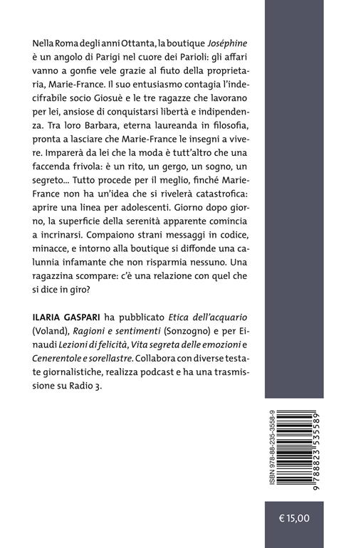 Nella Roma degli anni Ottanta, la boutique Joséphine è un angolo di Parigi nel cuore dei Parioli: gli affari vanno a gonfie vele grazie al fiuto della proprietaria, Marie-France, che accoglie le clienti con il suo seducente accento francese. Il suo entusiasmo contagia l'indecifrabile socio Giosuè e le tre ragazze che lavorano per lei, ansiose di conquistarsi libertà e indipendenza. Tra loro Barbara, eterna laureanda in filosofia arrivata in negozio per caso, pronta a lasciare che Marie-France le insegni a vivere. Imparerà da lei che la moda è tutt'altro che una faccenda frivola: è un rito, un gergo, un sogno, un segreto… Per chi come Marie-France ne ha fatto una missione, è un antidoto al dolore, all'angoscia di scomparire, ai cambiamenti che il tempo infligge. Tutto procede per il meglio, finché Marie-France non ha un'idea che si rivelerà catastrofica: aprire una linea per adolescenti. Giorno dopo giorno, la superficie della serenità apparente comincia a incrinarsi. Compaiono strani messaggi in codice, minacce, e intorno alla boutique si diffonde una calunnia infamante che non risparmia nessuno. Le voci serpeggiano e nel quartiere cresce l'ostilità verso Marie-France e i suoi. Una ragazzina scompare: c'è una relazione con quel che si dice in giro?