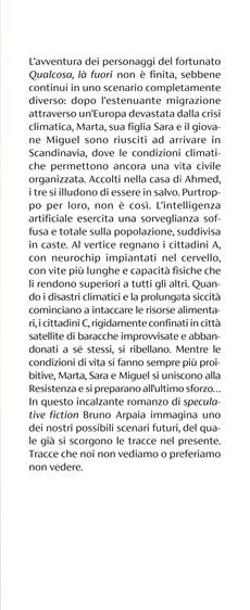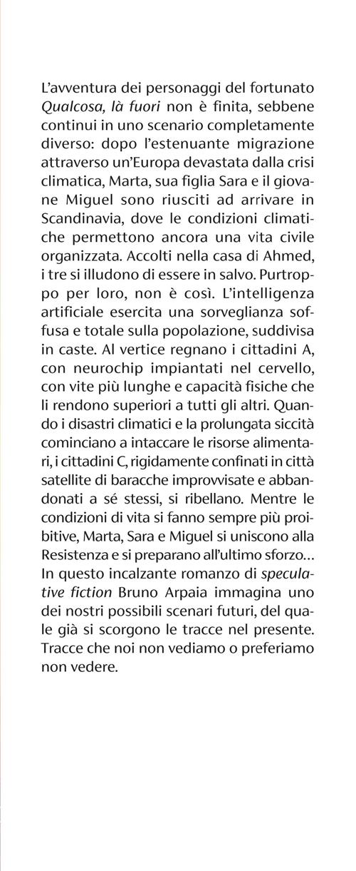 L’avventura dei personaggi del fortunato Qualcosa, là fuori non è finita, sebbene continui in uno scenario completamente diverso: dopo l’estenuante migrazione attraverso un’Europa devastata dalla crisi climatica, Marta, sua figlia Sara e il giovane Miguel sono riusciti ad arrivare in Scandinavia, dove le condizioni climatiche permettono ancora una vita civile organizzata. Accolti nella casa di Ahmed, i tre si illudono di essere in salvo. Purtroppo per loro, non è così. L’intelligenza artificiale esercita una sorveglianza soffusa e totale sulla popolazione, suddivisa in caste. Al vertice regnano i cittadini A, con neurochip impiantati nel cervello, con vite più lunghe e capacità fisiche che li rendono superiori a tutti gli altri. Quando i disastri climatici e la prolungata siccità cominciano a intaccare le risorse alimentari, i cittadini C, rigidamente confinati in città satellite di baracche improvvisate e abbandonati a sé stessi, si ribellano. Mentre le condizioni di vita si fanno sempre più proibitive, Marta, Sara e Miguel si uniscono alla Resistenza e si preparano all’ultimo sforzo…