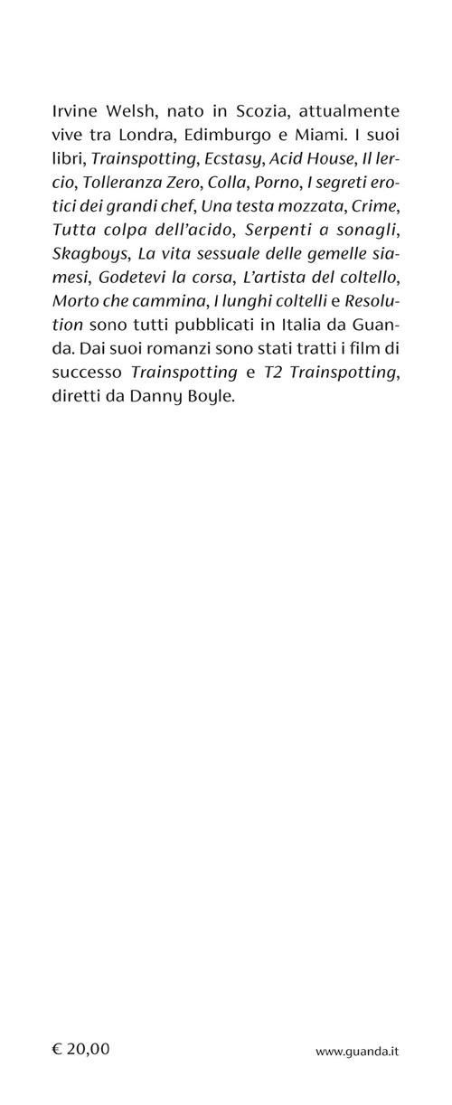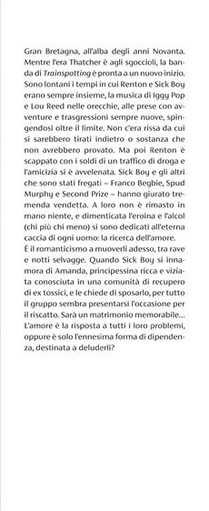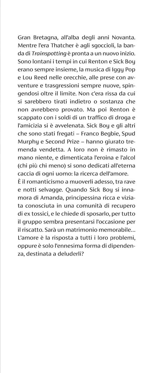 Gran Bretagna, all’alba degli anni Novanta. Mentre l’era Thatcher è agli sgoccioli, la banda di Trainspotting è pronta a un nuovo inizio. Sono lontani i tempi in cui Renton e Sick Boy erano sempre insieme, la musica di Iggy Pop e Lou Reed nelle orecchie, alle prese con avventure e trasgressioni sempre nuove, spingendosi oltre il limite. Non c’era rissa da cui si sarebbero tirati indietro o sostanza che non avrebbero provato. Ma poi Renton è scappato con i soldi di un traffico di droga e l’amicizia si è avvelenata. Sick Boy e gli altri che sono stati fregati – Franco Begbie, Spud Murphy e Second Prize – hanno giurato tremenda vendetta. A loro non è rimasto in mano niente, e dimenticata l’eroina e l’alcol (chi più chi meno) si sono dedicati all’eterna caccia di ogni uomo: la ricerca dell’amore. È il romanticismo a muoverli adesso, tra rave e notti selvagge. Quando Sick Boy si innamora di Amanda, principessina ricca e viziata conosciuta in una comunità di recupero di ex tossici, e le chiede di sposarlo, per tutto il gruppo sembra presentarsi l’occasione per il riscatto. Sarà un matrimonio memorabile…L’amore è la risposta a tutti i loro problemi, oppure è solo l’ennesima forma di dipendenza, destinata a deluderli?