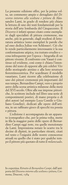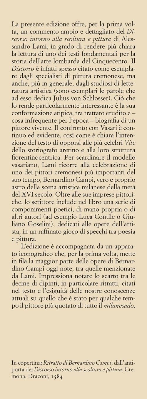 La presente edizione offre, per la prima volta, un commento ampio e dettagliato del "Discorso intorno alla scoltura e pittura" di Alessandro Lami, in grado di rendere più chiara la lettura di uno dei testi fondamentali per la storia dell'arte lombarda del Cinquecento. Il Discorso è infatti spesso citato come esemplare dagli specialisti di pittura cremonese, ma anche, più in generale, dagli studiosi di letteratura artistica (sono esemplari le parole che ad esso dedica Julius von Schlosser). Ciò che lo rende particolarmente interessante è la sua conformazione atipica, tra trattato erudito e – cosa infrequente per l'epoca – biografia di un pittore vivente. Il confronto con Vasari è continuo ed evidente, così come è chiara l'intenzione del testo di opporsi alle più celebri Vite dello storiografo aretino e alla loro struttura fiorentinocentrica. Per scardinare il modello vasariano, Lami ricorre alla celebrazione di uno dei pittori cremonesi più importanti del suo tempo, Bernardino Campi, vero e proprio astro della scena artistica milanese della metà del XVI secolo. Oltre alle sue imprese pittoriche, lo scrittore include nel libro una serie di componimenti poetici, di mano propria o di altri autori (ad esempio Luca Contile o Giuliano Goselini), dedicati alle opere dell'artista, in un raffinato gioco di specchi tra poesia e pittura.