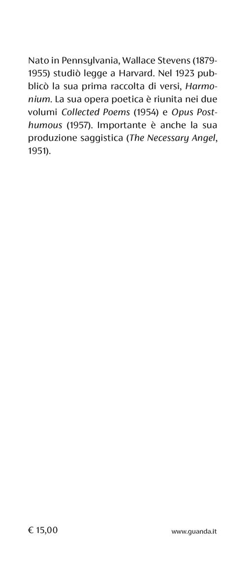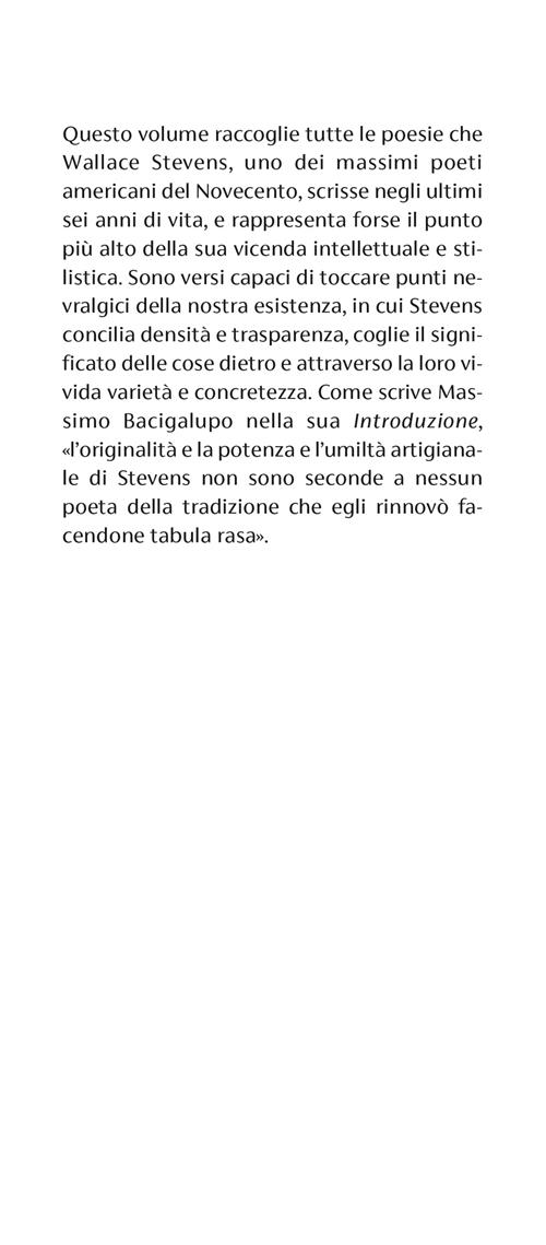Questo volume raccoglie tutte le poesie che Wallace Stevens, uno dei massimi poeti americani del Novecento, scrisse negli ultimi sei anni di vita, e rappresenta forse il punto più alto della sua vicenda intellettuale e stilistica. Sono versi capaci di toccare punti nevralgici della nostra esistenza, in cui Stevens concilia densità e trasparenza, coglie il significato delle cose dietro e attraverso la loro vivida varietà e concretezza.