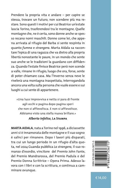 Prendere la propria vita e andare - per capire se stessa, trovare un futuro, non scendere più ma restare. Sono questi i motivi per cui, una mattina di maggio, Beatrice lascia Torino per trasferirsi tra le montagne. Quelle montagne che, ne è certa, sono donne anche se spesso recano nomi maschili. Donne come lei, che appena arrivata al rifugio del Barba, un uomo burbero dal passato misterioso, si sente respinta, in quanto «fumna e strangera». Marta Aidala ha il coraggio di una voce limpida che lascia parlare i gesti e gli accadimenti, i rumori del bosco, gli odori, la luce di un cielo alto sopra le cime. E sa raccontare nei dettagli più concreti una nuova epica, quella di una ragazza che va dietro alla propria libertà nonostante le esitazioni e le paure, una ragazza che cerca se stessa nei sentieri e tra gli uomini di montagna, in un mondo che sente suo anche se le vecchie tradizioni la guardano con diffidenza. Con timore e curiosità, come la guarda Elbio, il giovane malgaro con cui Beatrice instaurerà un legame profondo, fatto di ritrosie e slanci, in quell'intimità fragile e struggente che nasce tra due persone che si specchiano e si riconoscono. Quando l'estate finisce Beatrice però decide di non seguire Elbio a valle, rimane invece assieme al Barba in rifugio, luogo che ora, forse, sente di poter chiamare casa. Ma l'inverno senza neve le rivelerà una montagna inaspettata, spingendola a rimettere tutto in discussione, e interrogandola ancora una volta sul suo futuro, sulla persona che vuole essere e sui luoghi a cui sente di appartenere.