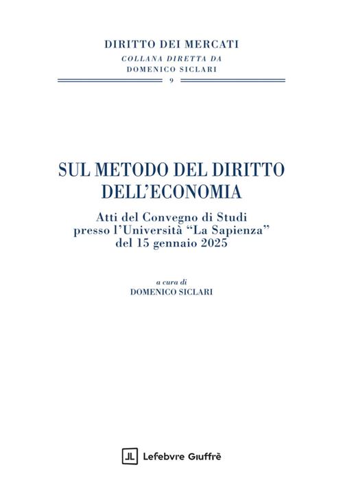 Il volume accoglie gli Atti del Convegno “Sul metodo del diritto dell'economia”, che si è tenuto presso l'Università “La Sapienza” di Roma il 15 gennaio 2025. Nel diritto dell'economia il metodo, quale percorso che lo studioso segue per condurre una ricerca di carattere scientifico, risulta funzionale ad indagarne l'oggetto precipuo, i.e. la regolazione dell'economia e le regole di funzionamento dei singoli mercati, regole funzionalizzate ad assicurare l'effettività dello stesso mercato. Numerosi sono i profili che incrociano una riflessione sul metodo distintivo del diritto dell'economia quale luogo di un'identità riconoscibile e condivisa, di una matrice comune di valori e conoscenze che fonda l'unità della materia: l'interdisciplinarietà quale snodo di reciproco nutrimento fra saperi; la legalità costituzionale quale ordine di valori fondativo di regole e principi, pur nella consapevolezza della storicità e relatività dei valori; la necessità di costruzione sistematica, in uno con la contestuale visione problematica del sistema analizzato, alla luce della funzione ordinante dell'effettività del mercato; il criterio ordinativo delle fonti, pure dinanzi a fenomeni quali la globalizzazione che tendono a farlo apparire come recessivo, e l'incidenza più che in altri settori del formante sovranazionale ed eurounitario; la funzione ordinatrice dei principi rispetto ad una legislazione ipertrofica oramai instabile e frammentaria, spesso incoerente, che riceve la sua legittimazione (e trova i suoi limiti) nelle “crisi” economiche e nelle continue “emergenze”; l'emersione di nuovi principi (il principio di sussidiarietà, il principio di proporzionalità, il principio di precauzione, il principio di ragionevolezza, il principio di responsabilità intergenerazionale) idonei a governare la complessità del nostro tempo e a fornire i criteri di ingaggio per la corretta delineazione delle regole del mercato; la necessità di avere piena conoscenza e consapevolezza della realtà tecnica, spesso molto complessa, alla quale applicare le regole del mercato di riferimento, dovendosi spesso fare ricorso ad altre scienze (matematica finanziaria, statistica, etc.); l'utilizzo dell'analisi economica del diritto e la rilevanza della conformità al criterio di efficienza economica; l'utilizzo della comparazione, anche in un'ottica di competitività tra ordinamenti.