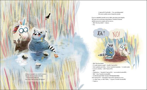 Un giorno l'unicorNO scappa da quel mondo di zucchero filato. Incontra un orsetto lavatore che non sta mai ad ascoltare, un cane che se ne infischia di tutto e una principessa che vuole sempre avere l'ultima parola. I quattro formano proprio una bella squadra. Infatti, persino essere cocciuti, insieme, è molto più divertente! Età di lettura: da 3 anni.
