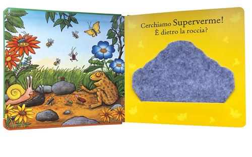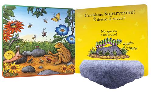 Un libro illustrato tattile per bambini dai 3 anni, con le pagine di cartone, angoli arrotondati e alette in feltro da sollevare in ogni pagina, perfetto per stimolare l'abilità e la sensibilità manuale del bambino. La lettura della storia può potenziare la coordinazione occhio-mano, sviluppare la capacità discorsiva, aiutare l'apprendimento tramite la ripetizione. Basato sul libro illustrato "Superverme", un libro per giocare, imparare e fare i primi passi tra i libri con alcuni dei personaggi nati dalla fantasia di Julia Donaldson e Axel Scheffler, creatori de "Il Gruffalò". Età di lettura: da 3 anni.