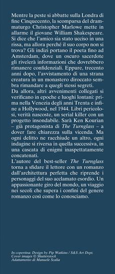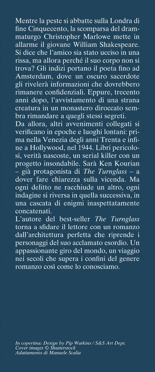 Mentre la peste si abbatte sulla Londra di fine Cinquecento, la scomparsa del drammaturgo Christopher Marlowe mette in allarme il giovane William Shakespeare. Si dice che l'amico sia stato ucciso in una rissa, ma allora perché il suo corpo non si trova? Gli indizi portano il poeta fino ad Amsterdam, dove un oscuro sacerdote gli rivelerà informazioni che dovrebbero rimanere confidenziali. Eppure, trecento anni dopo, l'avvistamento di una strana creatura in un monastero diroccato sembra rimandare a quegli stessi segreti. Da allora, altri avvenimenti collegati si verificano in epoche e luoghi lontani: prima nella Venezia degli anni Trenta e infine a Hollywood, nel 1944. Libri pericolosi, verità nascoste, un serial killer con un progetto insondabile. Sarà Ken Kourian – già protagonista di "The Turnglass" – a dover fare chiarezza sulla vicenda. Ma ogni delitto ne racchiude un altro, ogni indagine si riversa in quella successiva, in una cascata di enigmi inaspettatamente concatenati. L'autore di "The Turnglass" torna a sfidare il lettore con un romanzo dall'architettura perfetta che riprende i personaggi del suo acclamato esordio. Un appassionante giro del mondo, un viaggio nei secoli che supera i confini del genere romanzo così come lo conosciamo.