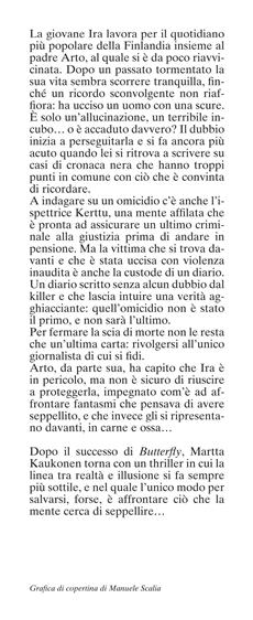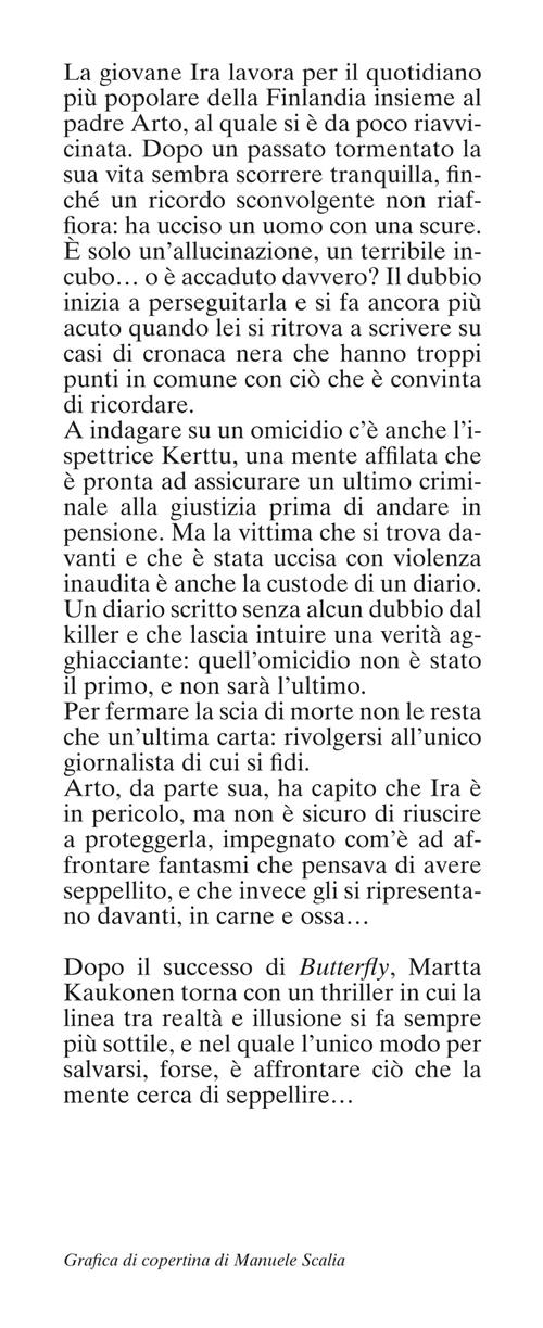 La giovane Ira lavora per il quotidiano più popolare della Finlandia insieme al padre Arto, al quale si è da poco riavvicinata. Dopo un passato tormentato la sua vita sembra scorrere tranquilla, finché un ricordo sconvolgente non riaffiora: ha ucciso un uomo con una scure. È solo un'allucinazione, un terribile incubo… o è accaduto davvero? Il dubbio inizia a perseguitarla e si fa ancora più acuto quando lei si ritrova a scrivere su casi di cronaca nera che hanno troppi punti in comune con ciò che è convinta di ricordare. A indagare su un omicidio c'è anche l'ispettrice Kerttu, una mente affilata che è pronta ad assicurare un ultimo criminale alla giustizia prima di andare in pensione. Ma la vittima che si trova davanti e che è stata uccisa con violenza inaudita è anche la custode di un diario. Un diario scritto senza alcun dubbio dal killer e che lascia intuire una verità agghiacciante: quell'omicidio non è stato il primo, e non sarà l'ultimo. Per fermare la scia di morte non le resta che un'ultima carta: rivolgersi all'unico giornalista di cui si fidi. Arto, da parte sua, ha capito che Ira è in pericolo, ma non è sicuro di riuscire a proteggerla, impegnato com'è ad affrontare fantasmi che pensava di avere seppellito, e che invece gli si ripresentano davanti, in carne e ossa... Dopo Butterfly, Martta Kaukonen torna con un thriller in cui la linea tra realtà e illusione si fa sempre più sottile, e nel quale l'unico modo per salvarsi, forse, è affrontare ciò che la mente cerca di seppellire…